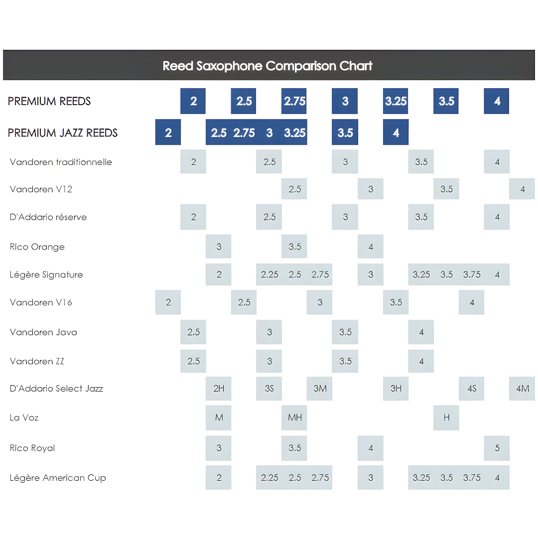 Cada modelo está calibrado con precisión por cuartos de fuerza (de 2.5 a 3.5), con una curva especialmente adaptada al jazz y las músicas contemporáneas, garantizando compatibilidad con los estándares más reconocidos del mercado.