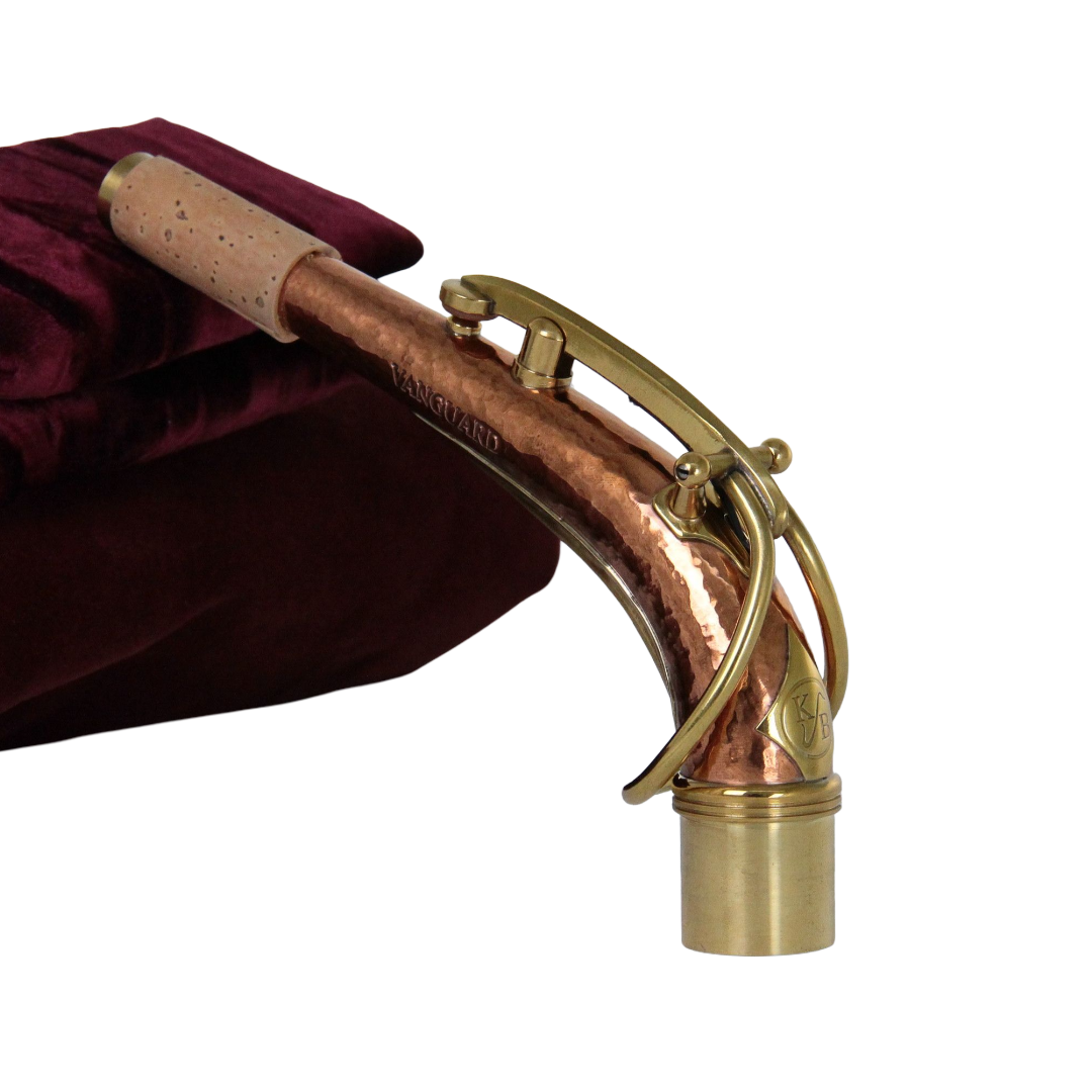 El tudel KB Sax Vanguard para saxofón alto, fabricado en cobre martillado a mano, ofrece un sonido lleno, con un núcleo definido en el rango medio y una proyección poderosa. Su carácter tonal y resistencia recuerdan al mítico Selmer Super Balanced Action de finales de los años 50.